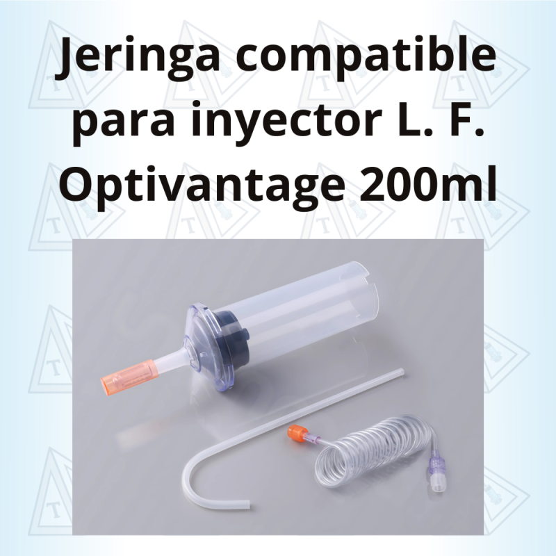 Jeringa descartable de alta presión con capacidad de 200 ml, especialmente diseñada para ser compatible con el inyector automático L. Flarsheim Optivantage. Fabricada con PVC transparente de uso clínico, esta jeringa ofrece resistencia, precisión y seguridad en procedimientos de tomografía con medio de contraste. Incluye todos los accesorios necesarios para una preparación completa y un uso eficiente en un solo empaque estéril y de apertura rápida.